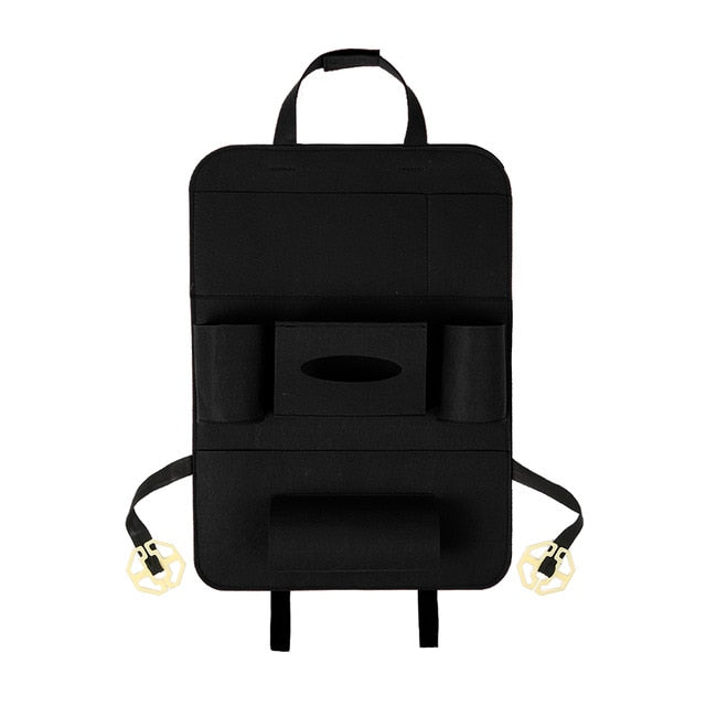 - Our backseat organizer is designed to perfectly hold your children's storage needs securely in place. Tissue holder wet wipes, snacks, headphones, bottles, crayons, umbrella; there is a place for them on this Car Backseat Organizer.